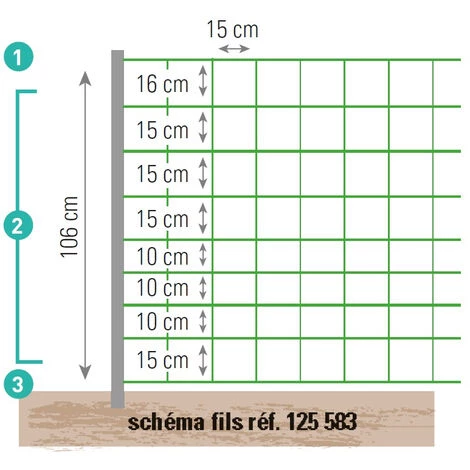 Ce filet de clôture est idéal pour garder vos chèvres grâce à sa hauteur adaptée ! Ce filet électrifiable de 50 mètres de long dont l’espacement des mailles ainsi que la hauteur de 1.06 m a été spécialement conçus pour la chèvre. Grâce à ses 14 piquets intégrés, ce filet est prêt à l’emploi et se pose facilement dans votre jardin ou dans un champ. Sa couleur jaune le rend particulièrement visible, évitant ainsi tout danger avec les enfants ou les promeneurs. Ce filet est électrifiable simplement en utilisant un électrificateur de clôture. Seuls les fils horizontaux sont électrifiés, les fils verticaux ne le sont pas. Chaque croisement de fils est soudé, garantissant ainsi une haute résistance à la déformation. Ce filet se compose de 9 fils horizontaux dont l’espacement varie en fonction de la hauteur. Détail du produit : Longueur : 50 m Hauteur: 106 cm 14 piquets Coloris: jaune Nombre de fils : 9 Fil porteur bas : 4 x 8 monofilant, diamètre 0.40 mm Fil porteur intermédiaires : 3 x 5 monofilant, diamètre 0.40 mm Fil porteur haut : 3 x 8 monofilant, diamètre 0.40 mm Fils horizontaux électrifiés, fils verticaux non électrifiés Diamètre du piquet : 13,2 mm Diamètre de la pointe : 6,5mm Fabriqué en Europe.