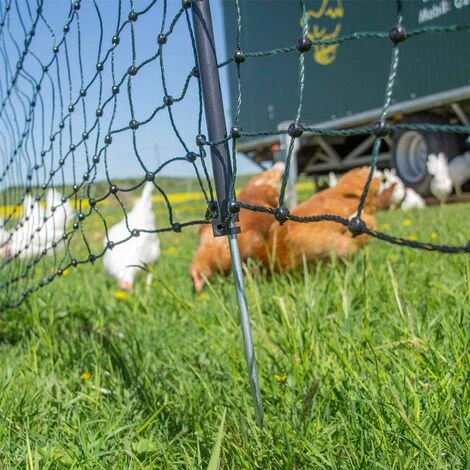 Le filet électrifiable pour volailles mesure 50 m de long et 1.2 m de haut, il convainc par sa très bonne qualité et son excellent rapport qualité-prix. Il peut être monté sans outils en quelques minutes seulement, il est ainsi possible de déplacer la clôture rapidement et facilement. 14 piquets simple pointe confèrent à ce filet une très bonne une stabilité et garantissent un maintien sûr du filet. Les brins supérieurs et inférieurs sont renforcés et rendent le filet encore plus robuste. Ce filet est parfait pour clôturer les poules, l’étang de jardin ou d’autres zones du jardin. Avec une longueur de 50 m et une hauteur de 120 cm, le filet de sécurité a les dimensions parfaites pour clôturer les volailles et autres petits animaux tels que les lapins. Le filet à volailles est vert et ne se remarque donc pas dans le jardin et dans les prairies. Un kit de réparation est fourni avec chaque filet. Nos conseils d’installation : Installez le filet sur la zone à clôturer Vérifiez qu’un piquet est installé dans chaque coin de votre installation. Si ce n’est pas le cas, rajoutez un piquet supplémentaire. Reliez le premier piquet au dernier de manière à fermer votre enclos. Installez un poteau en oblique derrière chaque coin de votre enclos de manière à tendre le filet. Pour tendre le filet sur une zone accidentée, installez des sardines sur les piquets qui sont les plus en hauteurs afin d’éviter la fuite des petits animaux. Voici un tutoriel dédié à l’installation d’un filet de clôture : LES TUTOS BY UKAL #3 : Comment installer et tendre un filet de clôture – YouTube