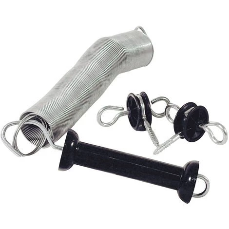 Kit complet de portail comprenant : 1 poignée avec crochet, 1 ressort et 2 isolateurs pour clôtures électriques.