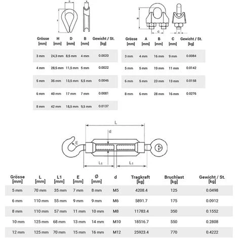 - Notre gamme comprend également d’autres sets de câbles métalliques de différents diamètres et constructions, ainsi que les accessoires appropriés tels que des serre-câbles, des cosses, des tendeurs, des crochets et bien d’autres produits.